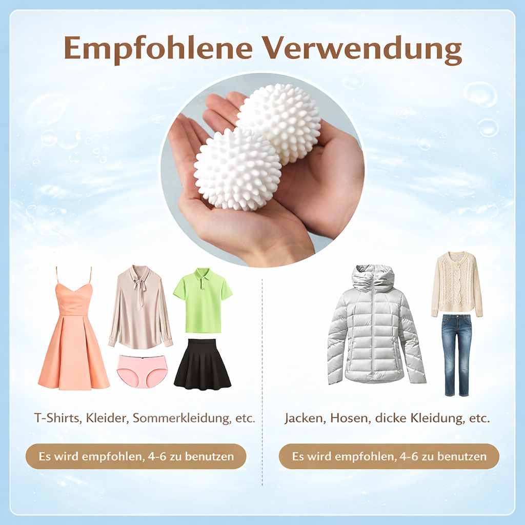 Durch die Bewegung in der Trommel hilft der Waschball dabei, Kleidung schonend zu lockern, Wasser und Waschmittel besser zu verteilen und Schmutz effektiver zu lösen. Gleichzeitig kann er dazu beitragen, Reibung und laute Geräusche beim Waschen zu verringern.